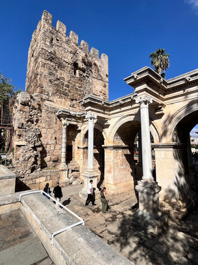 Once everyone was ready, we all took a walk to view the ocean and explore the old section of the city. Classic old city narrow streets with pavers wind through to coastline restaurants, parks and a harbor. The city was formerly known as Attalia and was founded in around 200 BC by King Attalus II of Pergamon. Attalia was soon conquered by the Romans. Roman rule saw the city thrive, including the construction of several new monuments, such as Hadrian's Gate which we visited.